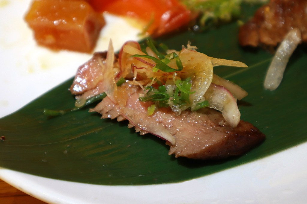 粉嫩多汁的厚切牛舌,搭配鮮紅福神漬、鮮綠青蔥與檸檬