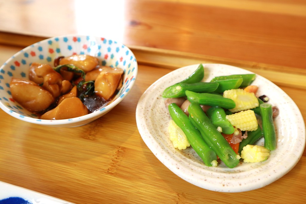 今天附的小菜,是三杯杏鮑菇和清炒四季豆+玉米筍