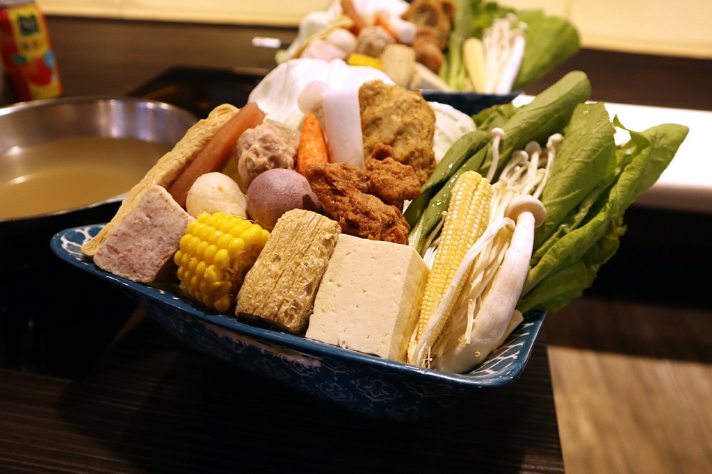 1公分厚的豆包、高麗菜、白菜、青江菜、芋頭、玉米筍、魷魚、蝦仁、綜合的火鍋料等