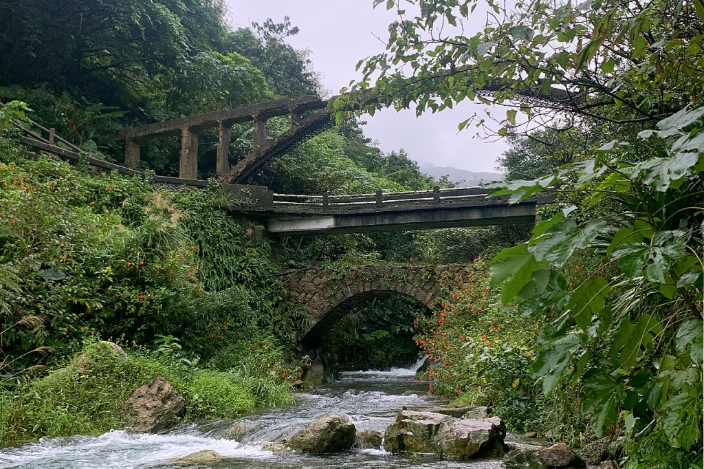 雖已斑駁,半圓形橋墩與外九份溪滾滾溪水