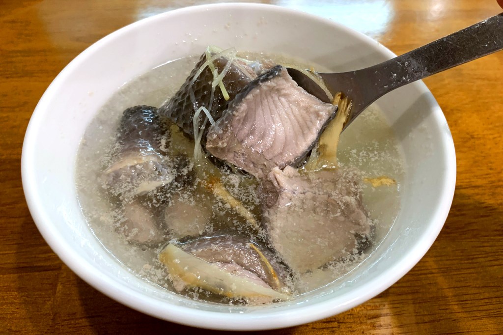 魚皮的份量給的相當滿足,且熟成度上,軟嫩中吃得到魚皮口感及肉鮮甜;不過可能除了薑絲外,還加了薑片,味道被薑味蓋過,魚湯應有的鮮甜味反而喝不太出來,這部份比較可惜。