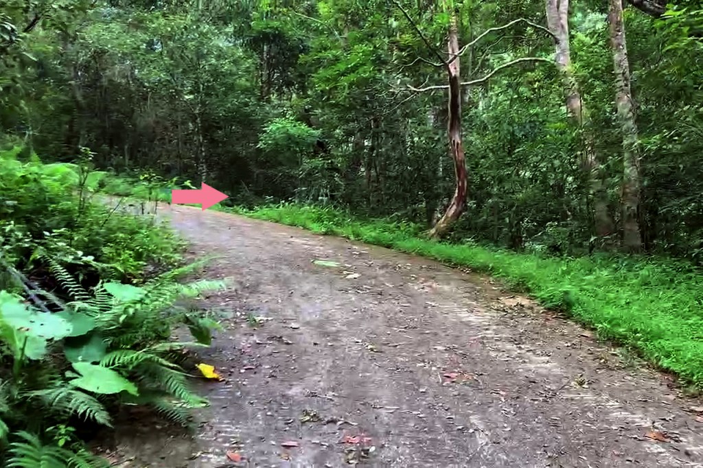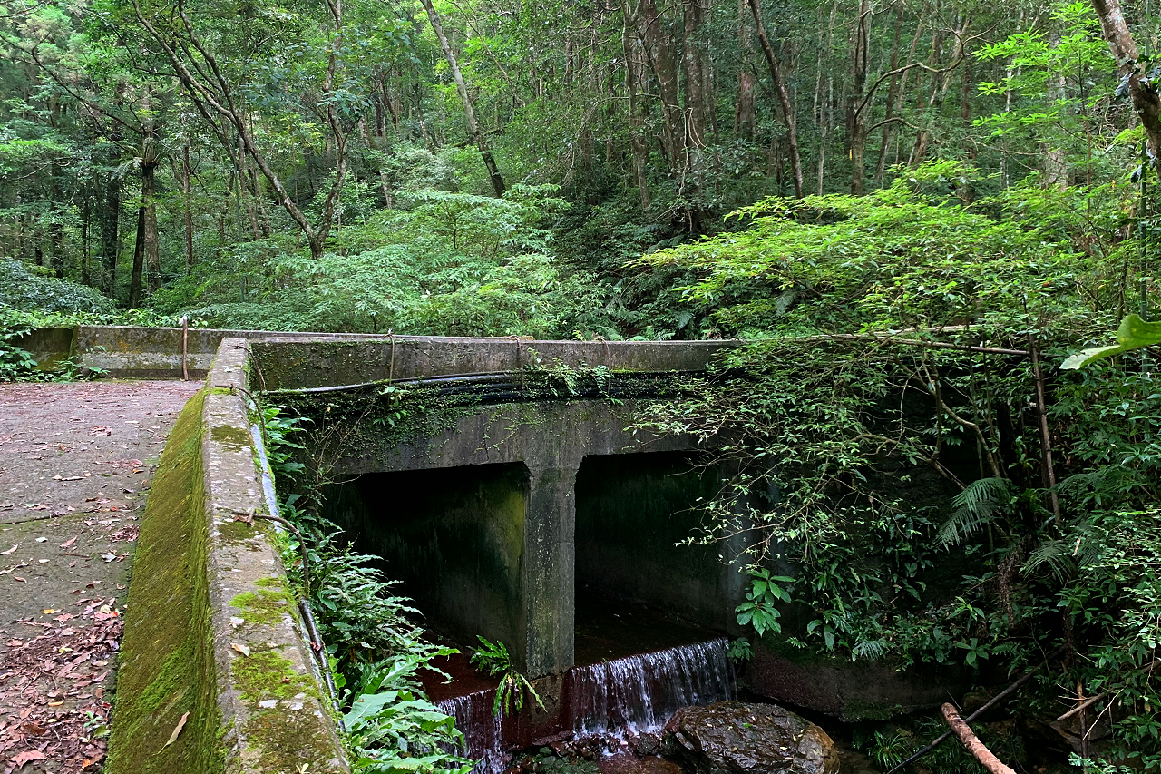 當走過1.5km距離路標、經過水泥路橋後,大約100公尺處,往路邊看會有一個小徑入口痕跡,這裡就是下切到鴛鴦瀑布溪谷的入口。