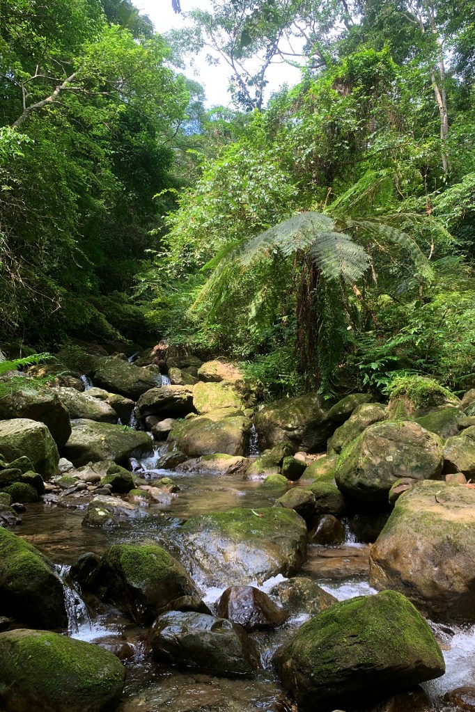 經歷數次腳滑、穿梭在林木岩石之間,終於到達下方溪谷,本先想好好喘口氣、踏一踏溪水,但一抬頭就看到……