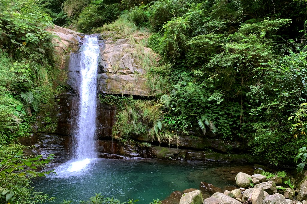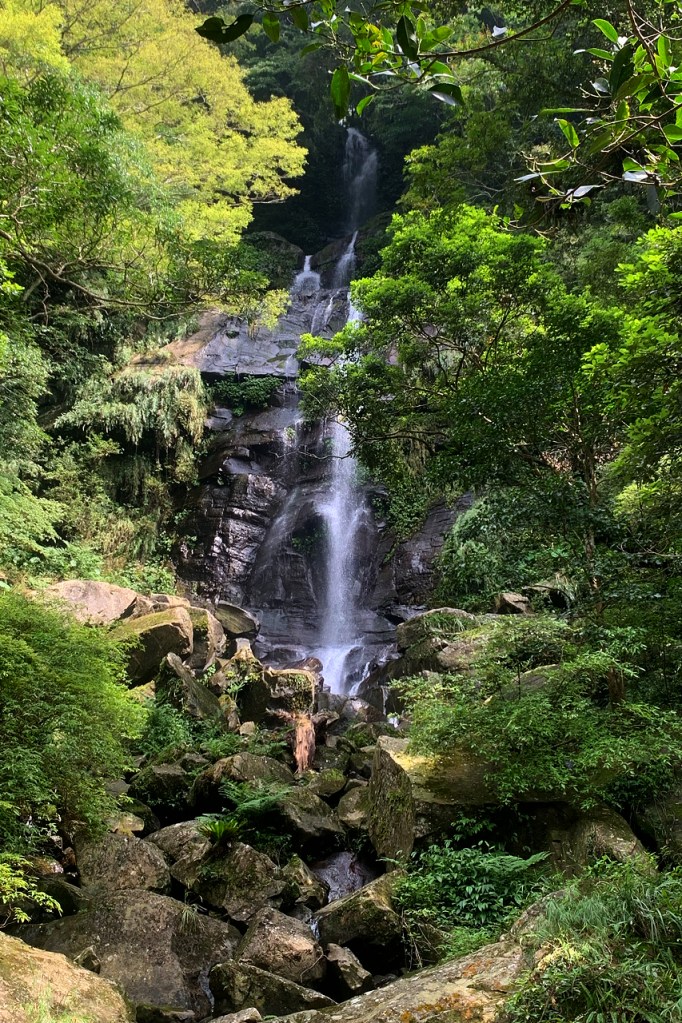 抬頭仰望鴛鴦瀑布,其秘境感、高落差的壯闊,絕對不下於當初看到雲森瀑布的感動,水量雖不大,但三層瀑布景色,與周圍林木、巨石融合成獨有的醍醐味。