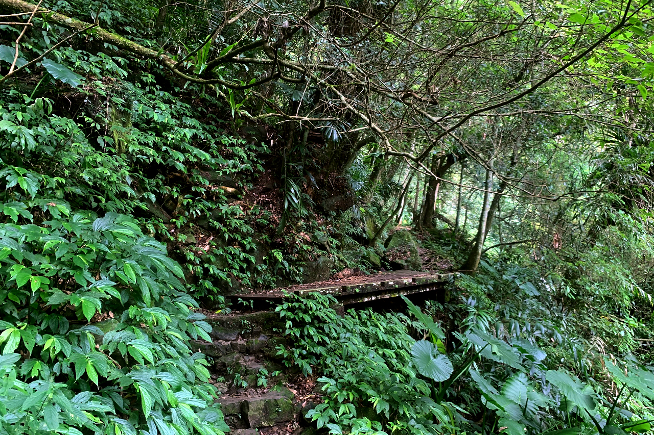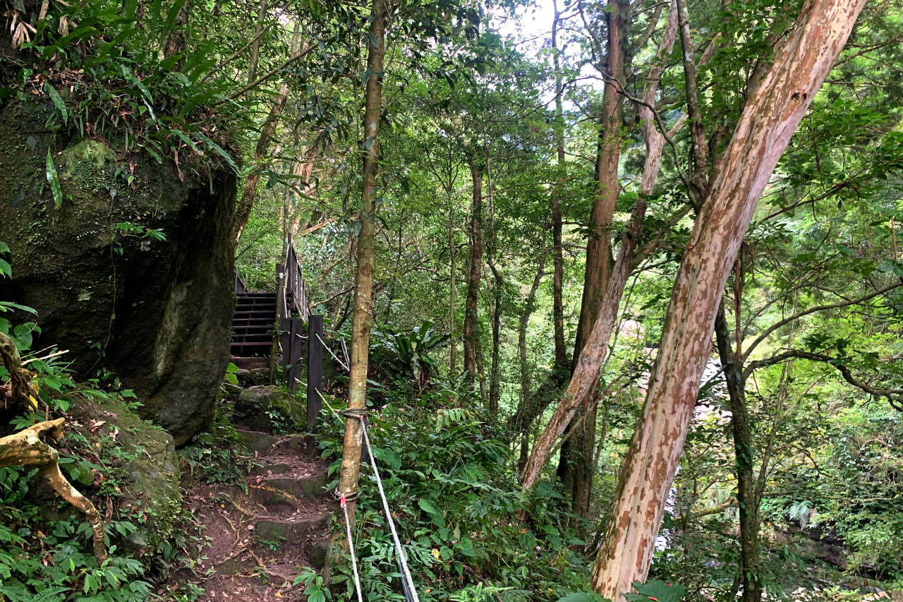 比起原始小徑,鱸潭瀑布的路況就顯得友善許多,有著石階、木棧道、簡易的護繩;但臨近溪水,所以因水氣造成的路面潮濕是無法避免,行走時還是要小心注意。
