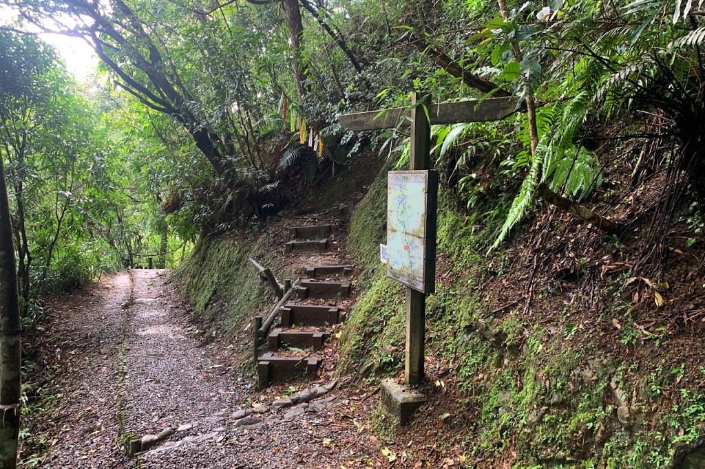 從這裡開始步道的路況偏原始,前段步道寬度縮減約一個人寬,且非常泥濘,建議攜帶登山杖及穿著防滑的健行鞋、登山鞋較為安全。