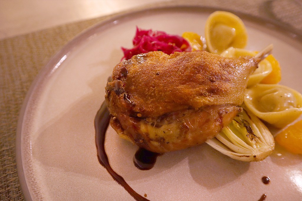 周圍義式圓餃,內餡鴨肉慕絲,如肝臟料理般的濃厚味道,除了夠味,也適合配合酒類一起服用。