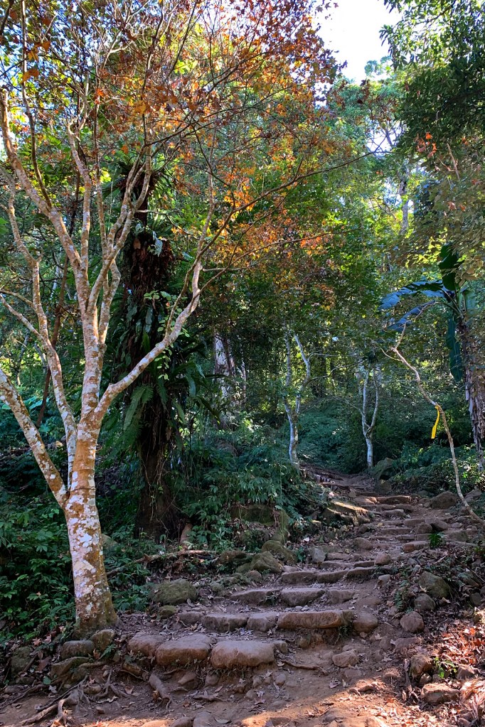 雖然這裡也有一些楓紅佈滿階梯,但當時真的也無心欣賞了,接近六、七十度的陡上,真的有些心累,只有慢慢調整呼吸、腳步慢慢登山三角點。