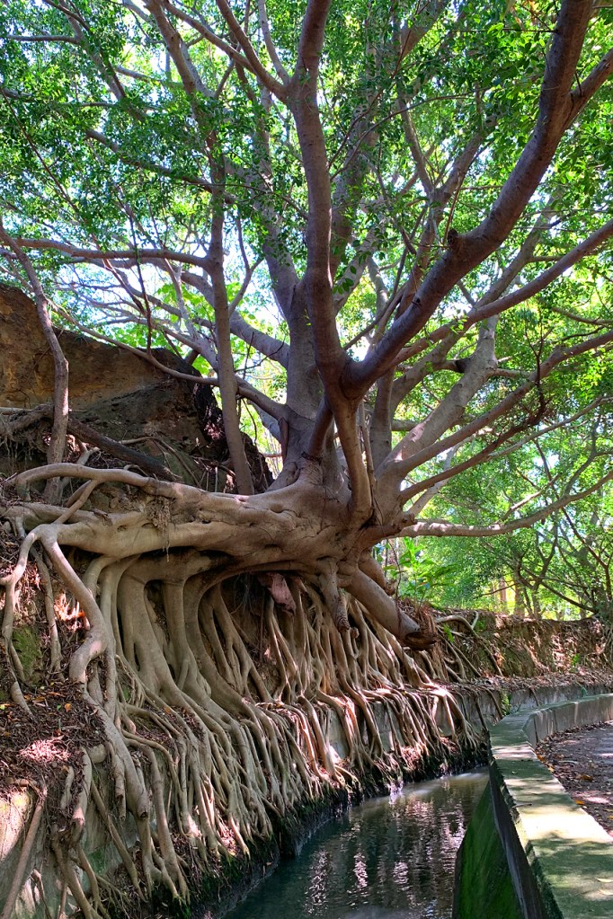 進入步道映入眼中的,就是盤根錯結的大榕樹,由於榕樹氣根的吸收水氣特性,在愈潮濕的環境下,氣根則是愈茂密,經年累月下,形成猶如章魚抓緊大地的即視感。