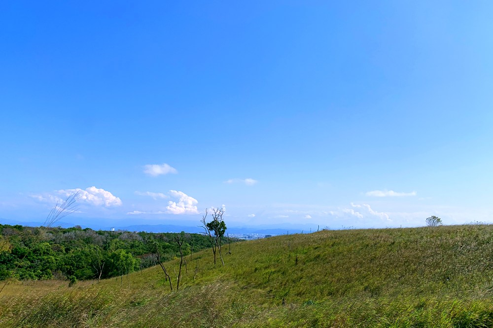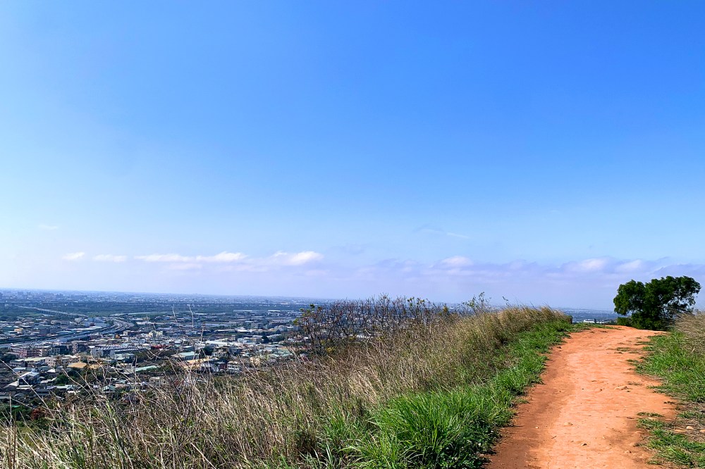 登頂後,紅土荒地與一望無際藍天市景呈現強烈的對比,在感受開闊舒暢的同時,轉身向後,紅土荒地、芒草卻也有一種荒涼悲壯的感覺。