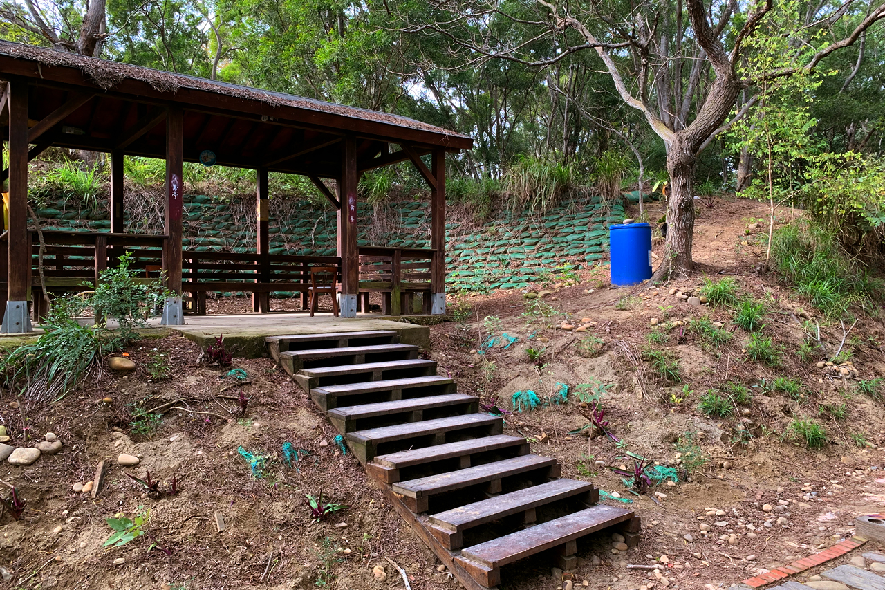 下來後,會到平坦的空地,如果要下山往空地左手邊的方向下去,就可以回到步道入口處;要往旗開得勝步道,先往右手邊小上坡,先到達-介壽亭。